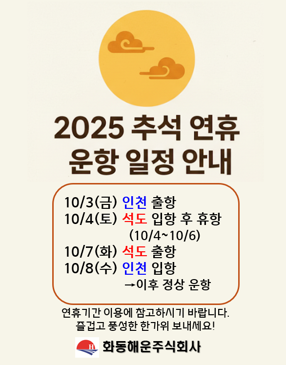 제목 | 2025년 추석 연휴 여객스케줄 안내 | ||